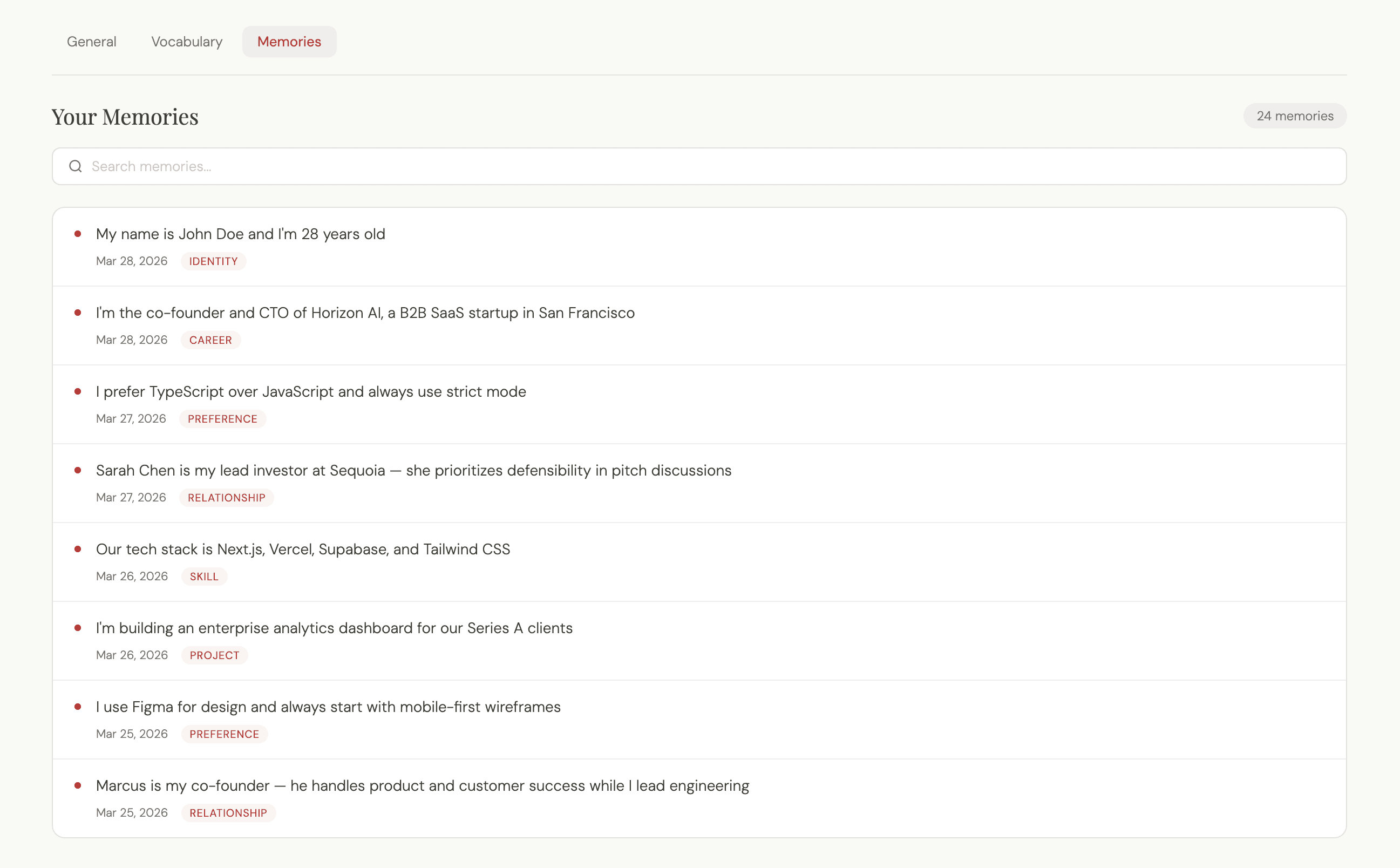 Press a shortcut. Speak naturally. Memvo transcribes — and silently builds a memory of everything you say, across every tool you use.